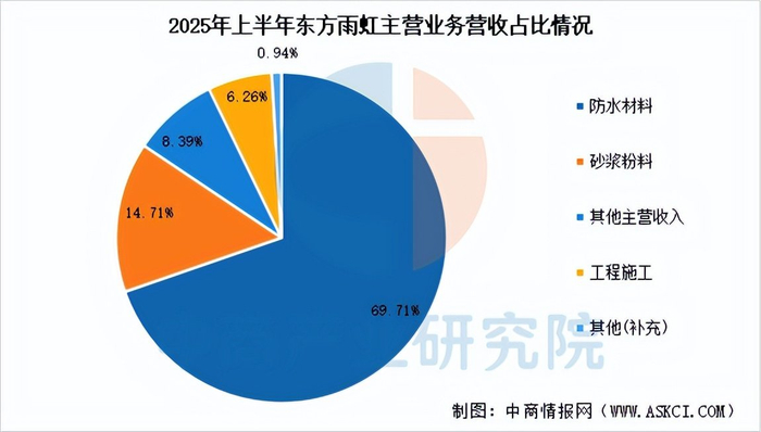 北京东方雨虹防水技术股份有限公司已形成以主营防水业务为核心,民用建材、砂浆粉料、建筑涂料、节能保温、胶粘剂、管业、建筑修缮、新能源、非织造布、特种薄膜、乳液等多元业务为延伸的建筑建材系统服务商。2025年前三季度,东方雨虹实现营业总收入206.01亿元,同比下降5.06%,归母净利润8.1亿元,同比下降36.61%。2025年上半年,公司防水材料收入94.59亿元,占比69.71%。