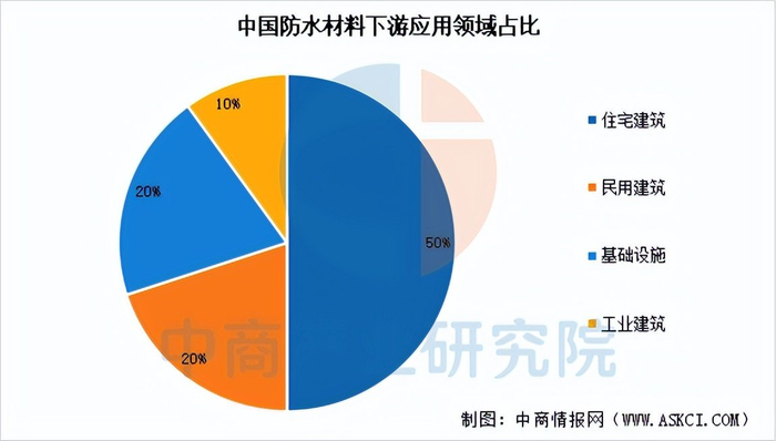 中商产业研究院发布的《2025-2030年中国防水材料行业深度研究及发展前景投资预测分析报告》显示,中国防水材料的应用以建筑领域为核心,其中住宅建筑是最大的需求来源,约占全部应用的50%;民用建筑(如商业综合体、公共建筑)占比约为20%;基础设施(包括铁路、轨道交通、桥梁隧道等)和工业建筑的需求占比分别约为20%和10%。