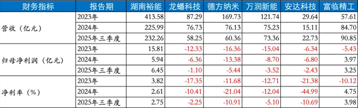 2025年前三季度,湖南裕能营收232.26亿元,归母净利润仅6.45亿元,净利率2.75%。而较之规模更小的德方纳米、万润新能、龙蟠科技、安达科技等企业自2023年至今连续亏损。