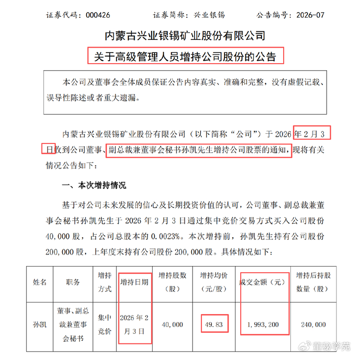 2月3日晚间收盘后,兴业银锡发布《关于高级管理人员增持公司股份的公告》,实际上就是董秘本人在增持。