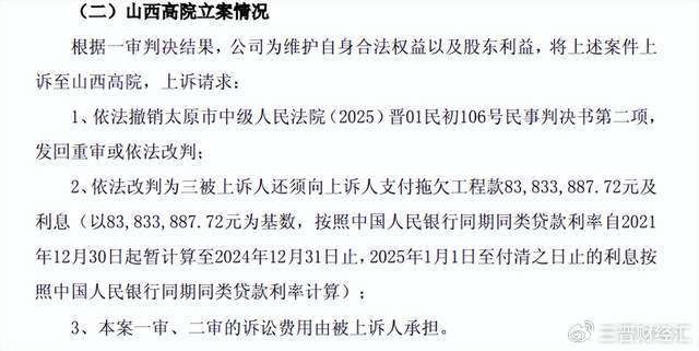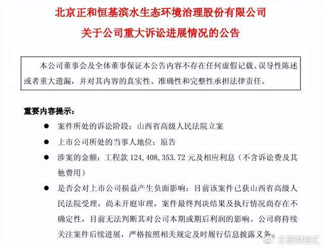 2022年9月,正和生态曾因晋阳湖相关工程款纠纷,起诉太原市公园服务中心等多个主体。诉讼涉及两项工程,累计金额约6.64亿元,合计未支付款项约4.09亿元。