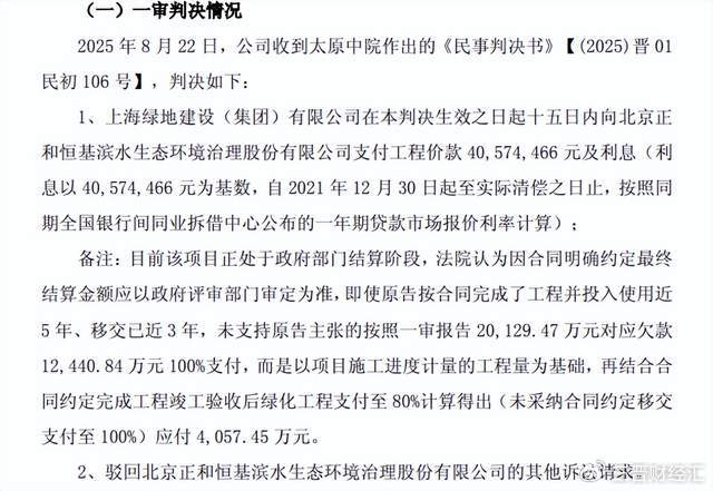 8月22日,太原中院作出一审判决:支持正和生态部分诉求,判决上海绿地建设向正和生态支付工程价款4057.45万元及相应利息。驳回了正和生态的其他诉讼请求。