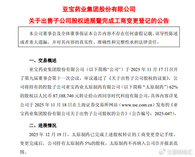 12月22日,亚宝药业发布公告,已完成上述股权转让的工商变更登记手续。变更完成后,公司持有亚宝药业太原制药5%的股权,不再纳入公司合并报表范围。