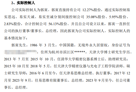 易思维成立于2017年,由天津大学精密测试技术及仪器国家重点实验室出身的郭寅与三位校友(尹仕斌、庄洵、郭磊)共同创立。截至招股书签署日,郭寅通过直接及间接方式合计控制公司56.13%股权,身兼董事长、总经理及核心技术人员数职,是公司绝对核心。