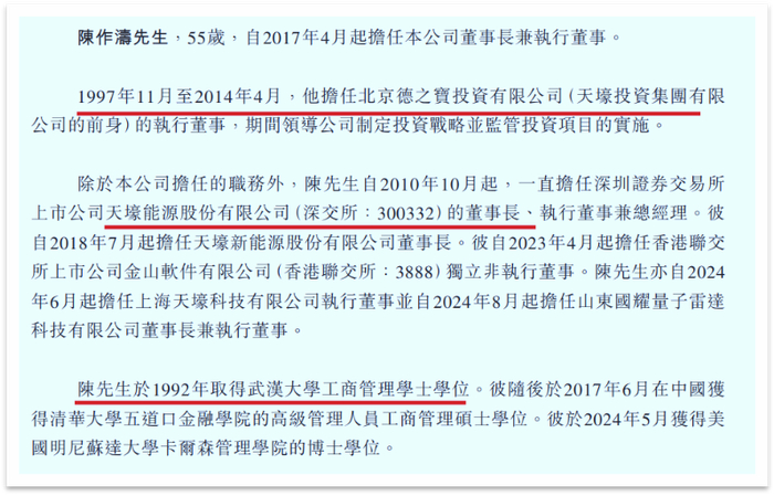据《星岛》查询,陈作涛出生于1970年,1992年毕业于武汉大学,毕业后曾在北京建材集团工作五年,后于1997年开始任职北京德之宝投资有限公司(后更名为天壕投资)执行董事。