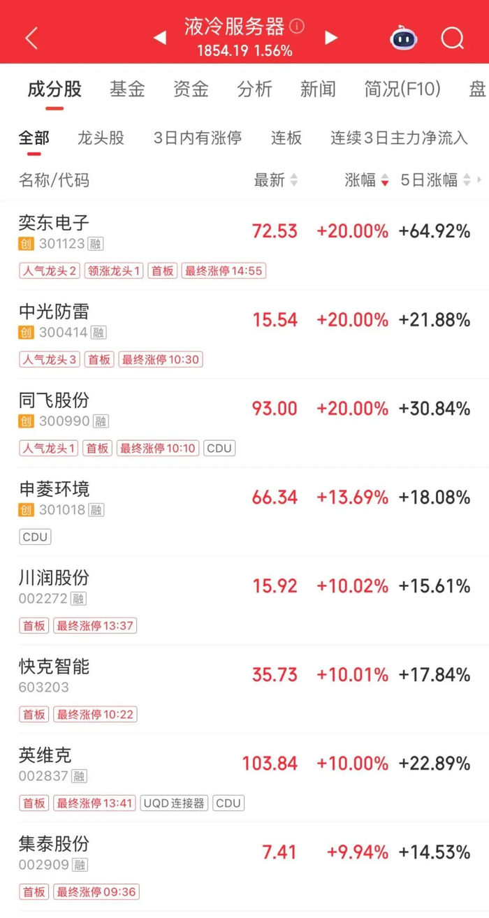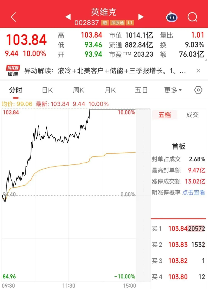 午后,液冷服务器概念持续活跃,算力芯片概念震荡回升。截至收盘,英维克涨停,股价创历史新高,报103.84元/股,总市值为1014.1亿元。奕东电子、中光防雷、同飞股份“20CM”涨停。