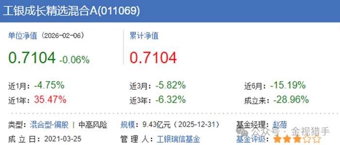 成立近四年,工银成长精选混合A最新单位净值仅剩0.7104元,较初始1元累计下跌近30%。这只由“医药女神”赵蓓掌舵的产品已陷医药股泥潭。