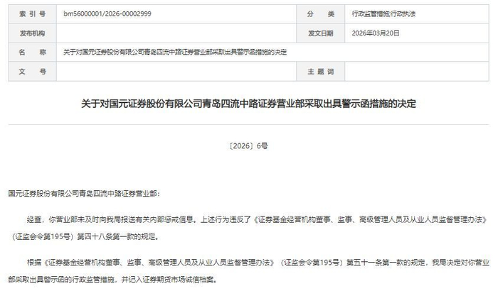 据这份〔2026〕6号监管函显示,国元证券四流中路营业部未及时向监管报送内部惩戒信息。违反《证券基金经营机构董事、监事、高级管理人员及从业人员监督管理办法》(证监会令第195号)第四十八条第一款。