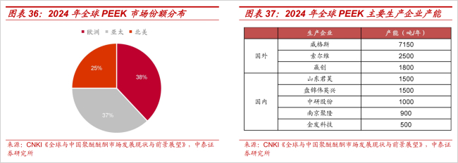 作为战略性原材料,PEEK材料行业呈现高度集中的市场格局,此前主要由海外巨头主导,2024年威格斯、索尔维和赢创三家企业的产能占全球比例超六成,其中仅威格斯一家占比就在四成以上。