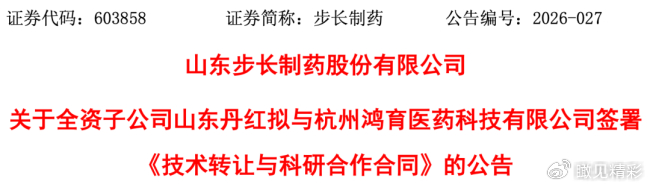3月13日,山东步长制药股份有限公司(以下简称“步长制药”)发布公告称,全资子公司山东丹红拟与鸿育医药就益气活血解郁颗粒临床前研究技术转让及其新药开发事宜签署合作合同。