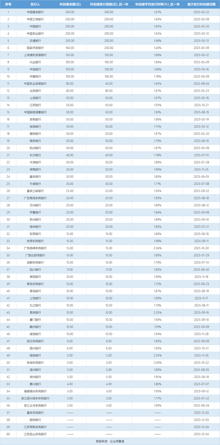 今年5月份,债券市场“科技板”正式落地,各类市场主体发行的科技创新债券(以下简称“科创债”)不仅规模不断攀升,发行节奏也持续加快。企业预警通数据显示,截至2025年12月2日,共有60家银行机构发行或计划发行科创债,科创债余额2776亿元,平均发行利率1.81%。