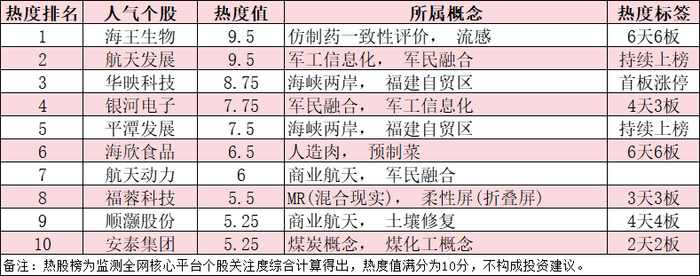 今日,A股十大人气热股如下:海王生物、航天发展、华映科技、银河电子、平潭发展、海欣食品、航天动力、福蓉科技、顺灏股份、安泰集团。