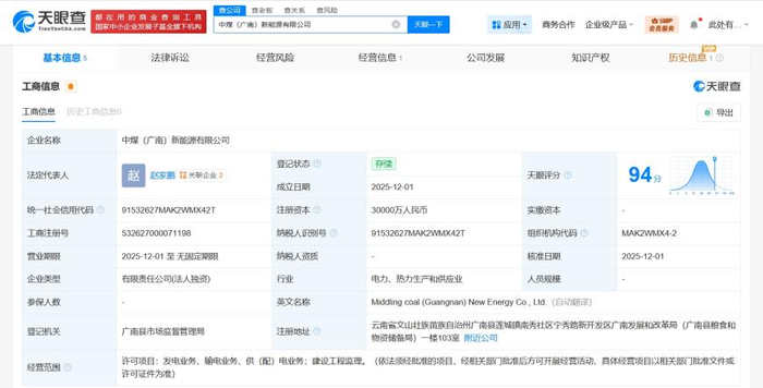 天眼查显示,近日,中煤(广南)新能源有限公司成立,法定代表人为赵家鹏,注册资本3亿人民币,经营范围为发电业务、输电业务、供(配)电业务,建设工程监理。股权全景穿透图显示,该公司由中煤绿能科技(北京)有限公司全资持股,后者为中国中煤能源集团有限公司全资子公司。