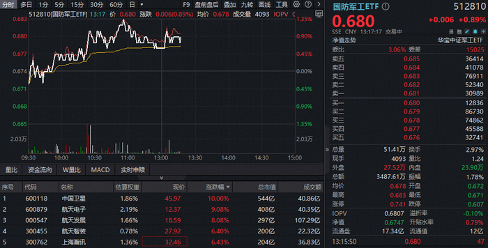 12月4日,国防军工板块反弹,商业航天概念再度领涨,中国卫星午后涨停,航天电子涨超8%创10 年新高,航天发展涨超7%创四年新高。场内热门国防军工ETF(512810)持仓多只商业航天龙头股,盘中摸高1.35%。