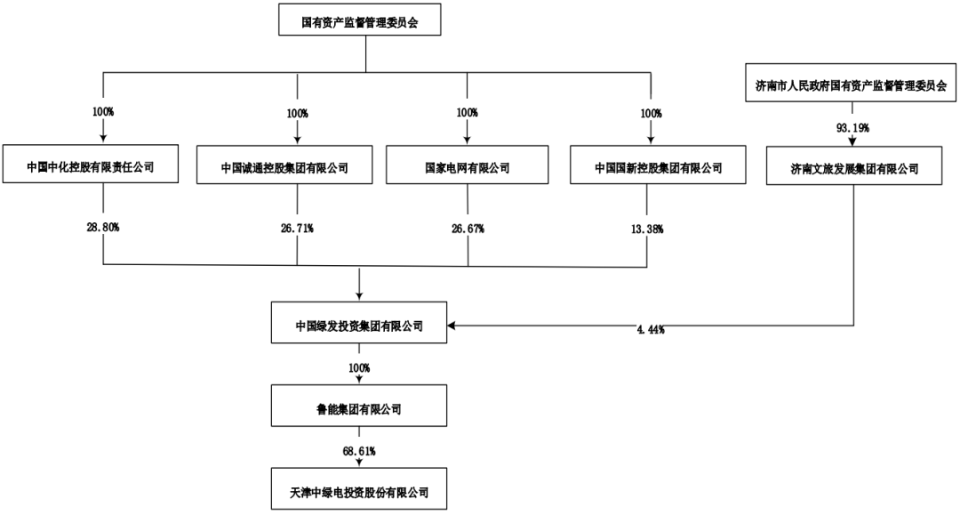 股权结构调整前,中国绿发将由中国诚通控股集团有限公司(41.11%股权)、中国国新控股有限责任公司(27.78%股权)、国家电网有限公司(26.67%股权)、济南文旅发展集团有限公司(4.44%股权)四方持股。