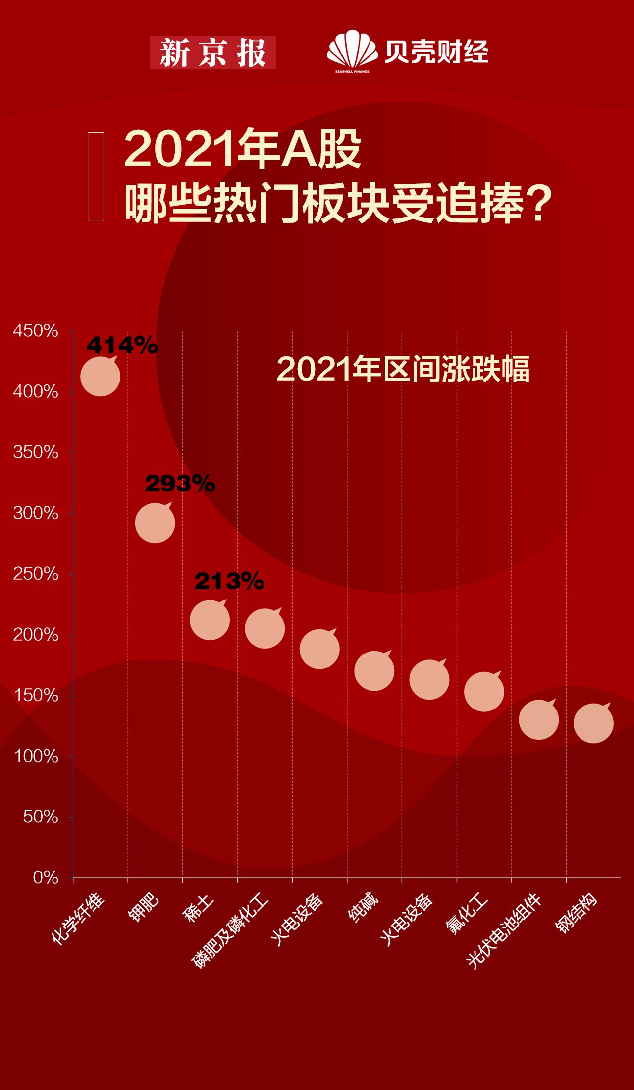 申万四级行业中,2021年涨幅最高的板块分别是化学纤维、钾肥、稀土、非金属材料、磷肥及磷化工、纯碱、火电设备、氟化工、光伏电池组件、钢结构。全年涨幅(总市值加权平均)均超100%。