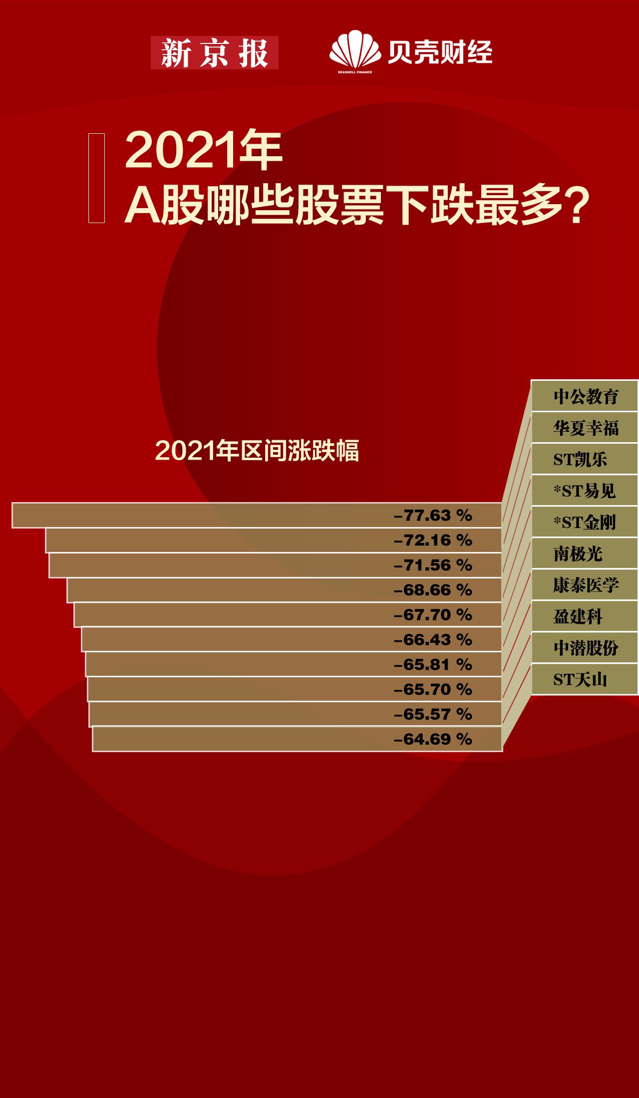 截至12月31日,全年跌幅最高的十大股票分别为中公教育、华夏幸福、ST凯乐、*ST易见、*ST金刚、南极光、康泰医学、盈建科、中潜股份、ST天山。