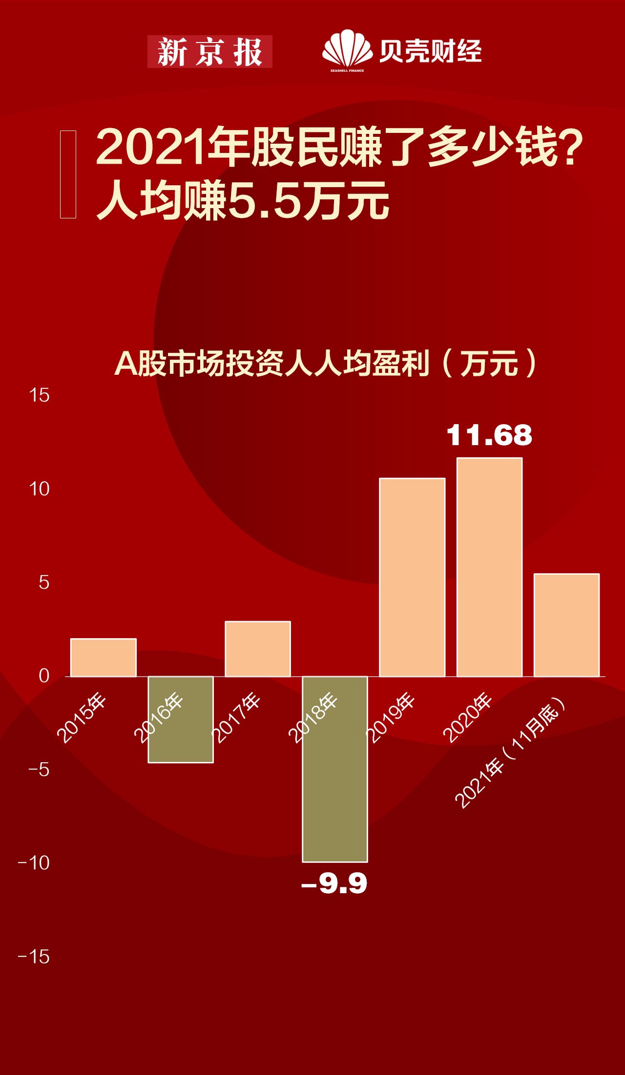 WIND数据显示,截至2021年12月31日,A股市场总流通市值为75.02亿元,较之2020年末的64.26亿元增加了10.76亿元。根据中国结算中心数据,按截至2021年11月底的1.96亿名投资者计算,2021年,A股市场投资者人均盈利5.48万元。