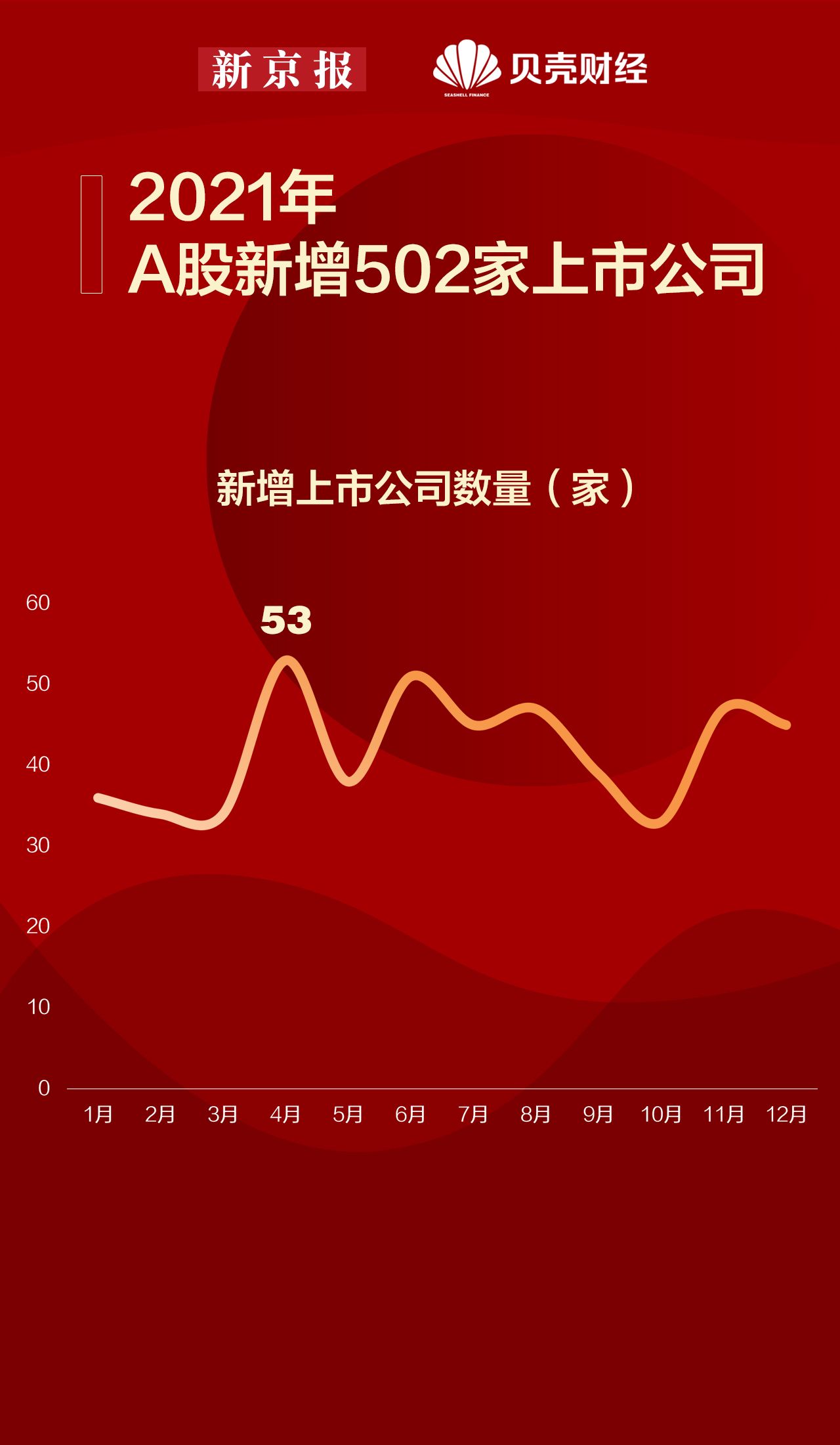 截至2021年12月31日,A股共有上市公司4697家,全年新增上市公司502家。从分月新增公司数量来看,4月、6月上市公司数量最多,均超过50家。