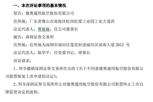 德奥通航15日晚间公告称,近日,德奥退收到深圳中院送达的案号为“(2022)粤03行初34号”《广东省深圳市中级人民法院受理案件通知书》,根据诉讼,德奥退要求判令撤销深圳证券交易所作出的《关于不同意德奥通用航空股份有限公司股票恢复上市申请的决定》;判令深圳证券交易所停止对德奥通用航空股份有限公司股票终止上市自律监管决定的流程。