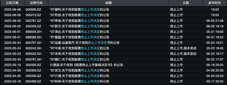 其中,*ST紫晶、*ST泽达均将于6月8日进入退市整理期,预计6月30日为最后交易日。*ST新文、*ST奇信均将于6月12日进入退市整理期,预计7月4日为最后交易日。