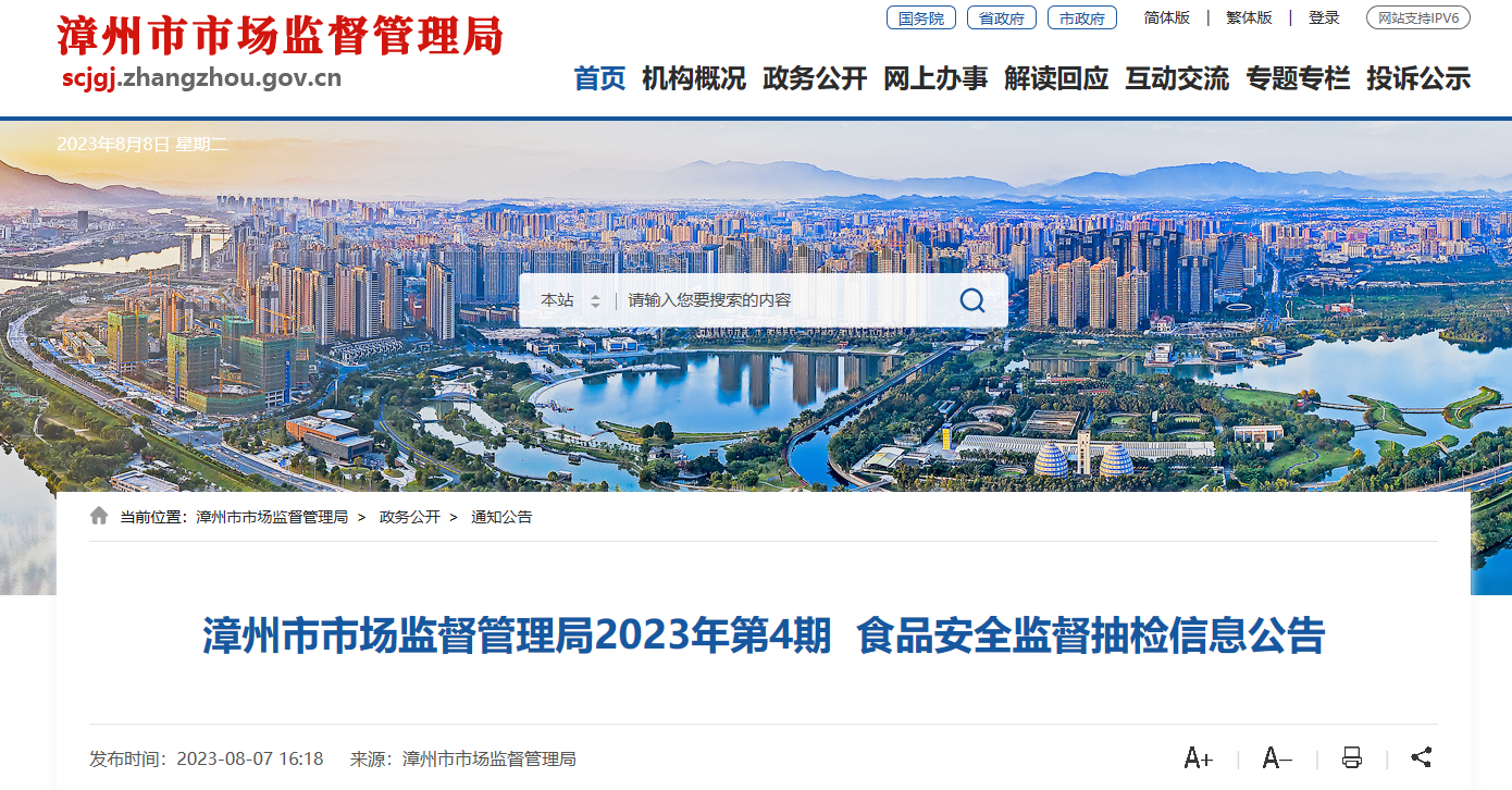 中国质量新闻网讯 近日,福建省漳州市市场监督管理局发布2023年第4期食品安全监督抽检信息公告。
