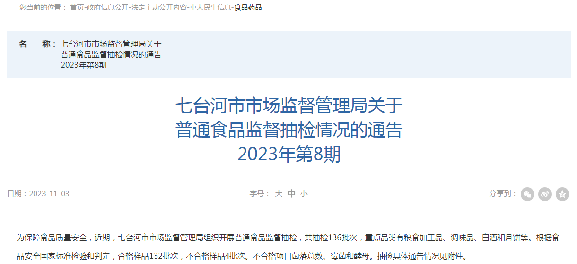 据通告,近期,七台河市市场监督管理局组织开展普通食品监督抽检,共抽检136批次,重点品类有粮食加工品、调味品、白酒和月饼等。根据食品安全国家标准检验和判定,合格样品132批次,不合格样品4批次。不合格项目菌落总数、霉菌和酵母。