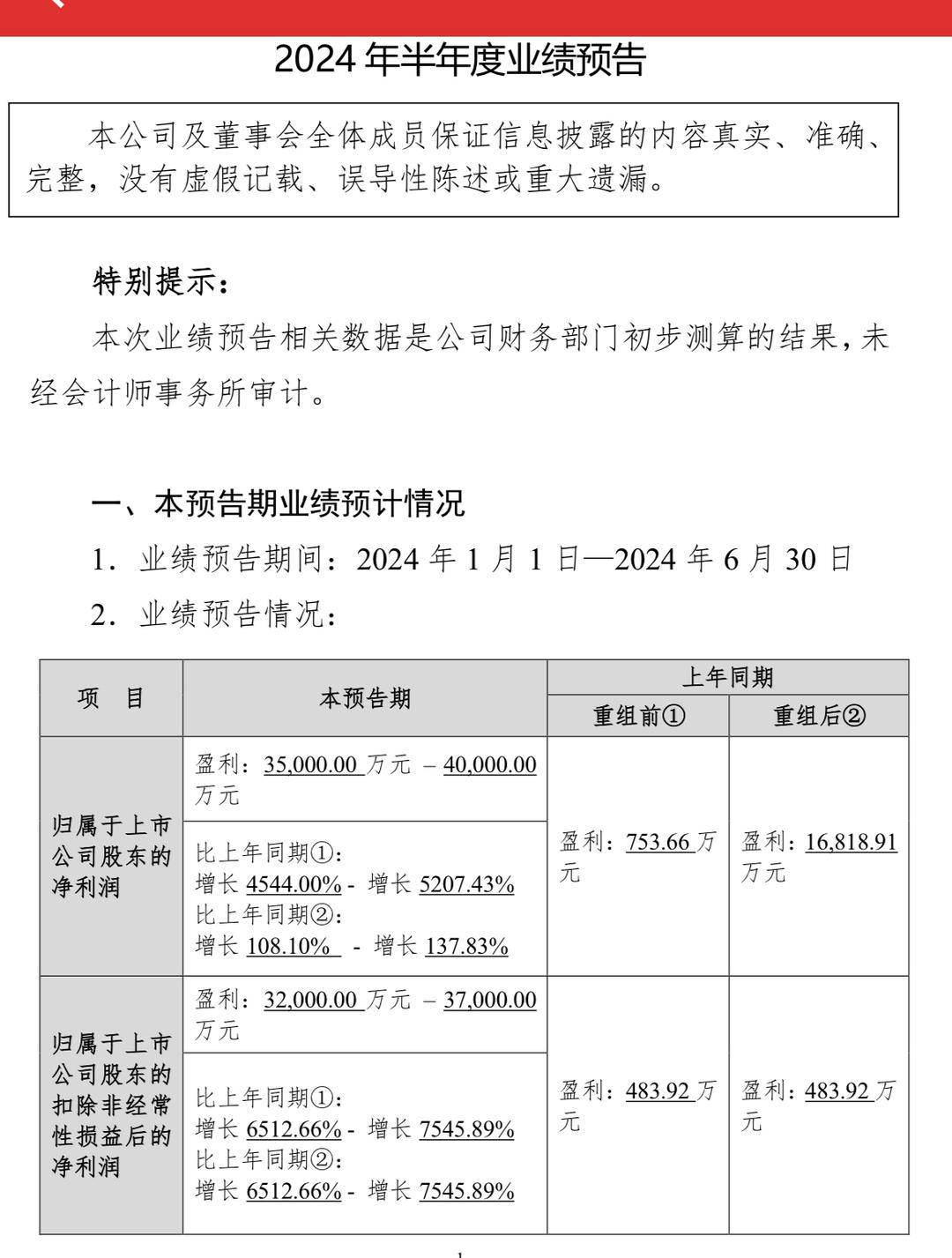 比如7月15日晚间,航天智造发布的2024年半年度业绩预告显示,公司预计2024年上半年归属于上市公司股东的净利润为盈利3.5亿元—4亿元,较上年同期(重组前)同比增长4544.00%—5207.43%,较上年同期(重组后)同比增长108.10%—137.83%,归属于上市公司股东的扣除非经常性损益后的净利润3.2亿元—3.7亿元,较上年同期增长6512.66%—7545.89%。