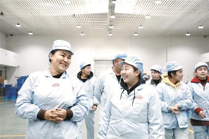 工作间隙,闫晓宇(前右)和同事开心地聊天(摄于2025年1月3日)。在新疆伊力特实业股份有限公司,有不少家庭妇女像闫晓宇一样实现了稳定就业,甚至成为家里的经济“顶梁柱”。