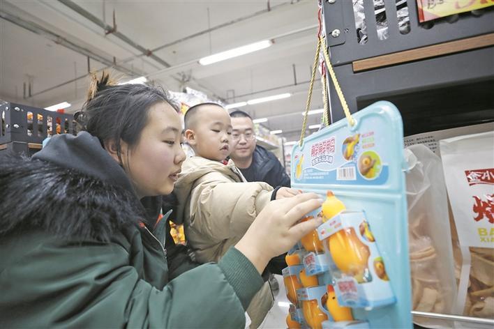 闫晓宇和丈夫带着孩子在超市购物(摄于2024年12月31日)。收入稳定的闫晓宇能消费、愿消费、敢消费。