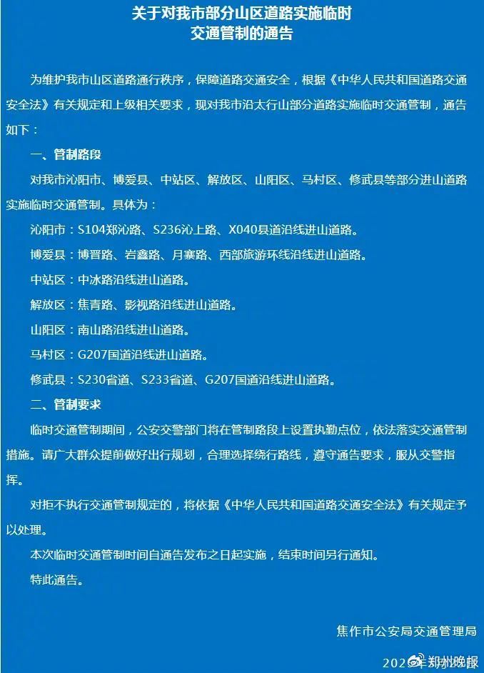 3月25日下午,焦作市公安局交通管理局发布了部分山区道路实施临时交通管制的通告。通告指出,为维护山区道路通行秩序,保障道路交通安全,对焦作市沿太行山部分道路实施临时交通管制,其中涉及沁阳、博爱、中站等一市二县四区的部分进山道路。
