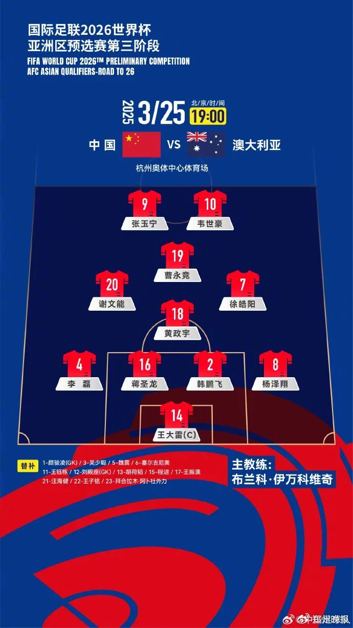 北京时间3月25日晚7时,国际足联2026世界杯亚洲区预选赛第三阶段(18强赛)C组第八轮,中国队在杭州奥体中心体育场“大莲花”主场迎战澳大利亚队。中国队公布了本场比赛的首发阵容,张玉宁和韦世豪将搭档锋线。