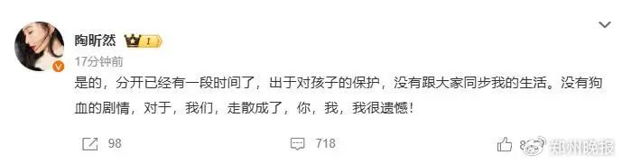 3月25日下午,演员陶昕然发微博宣布自己已离婚。她称:是的,分开已经有一段时间了,出于对孩子的保护,没有跟大家同步我的生活。没有狗血的剧情,对于,我们,走散成了,你,我,我很遗憾!