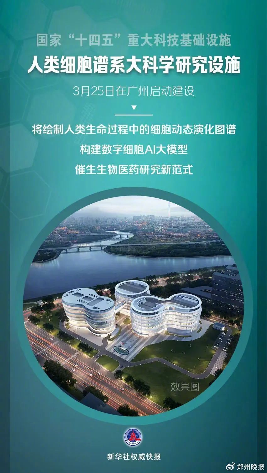 人类细胞谱系大科学研究设施3月25日启动建设。该设施位于广州国际生物岛,规划建设周期4.5年,总建筑面积超5万平方米。