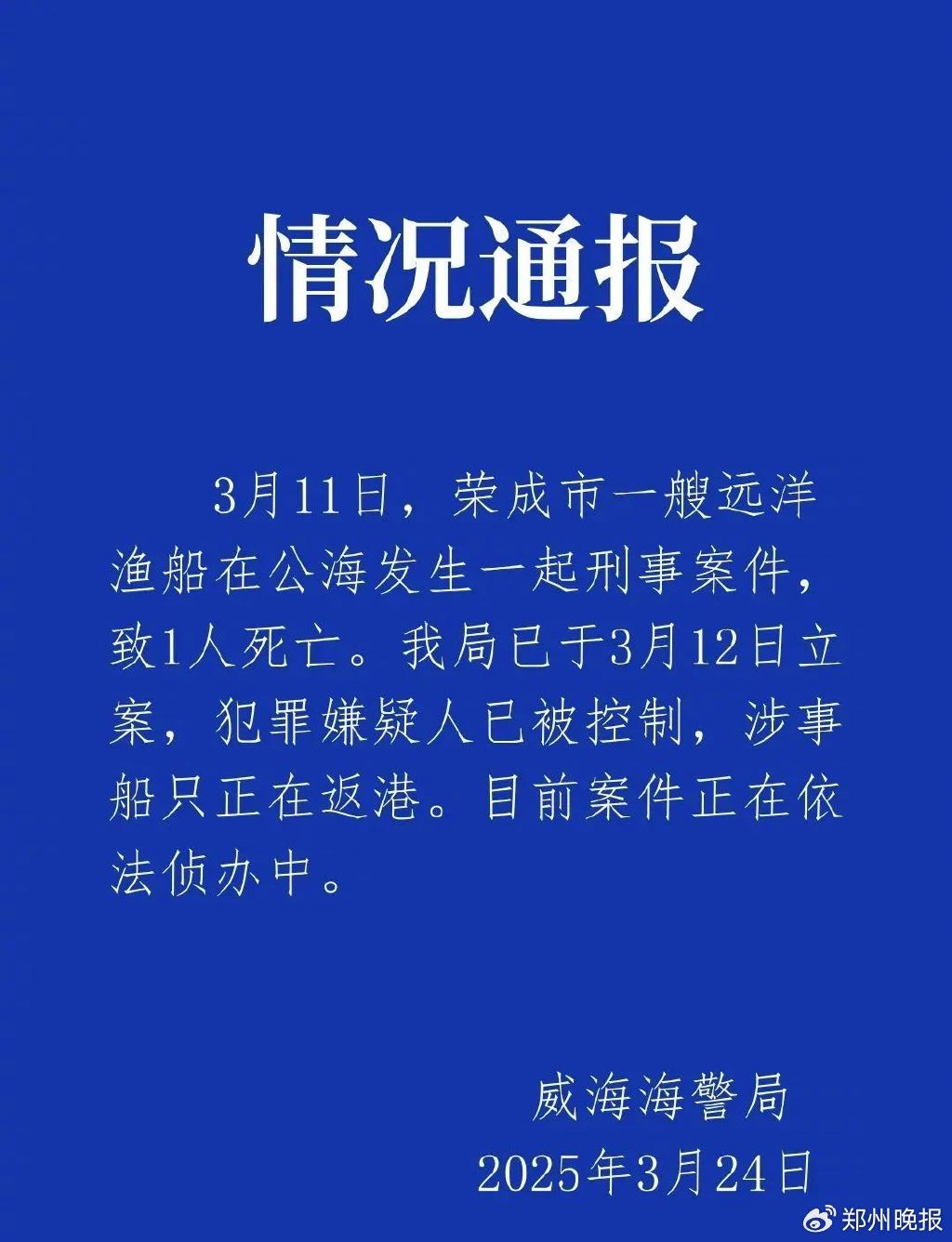网友小星(化名)近日在社交媒体发布信息称,其身为远洋渔船船长的父亲在印度洋公海海域被船员杀害,该案已获威海海警立案。24日晚,威海海警局发布情况通报:嫌犯已被控制,涉事船只正在返港。