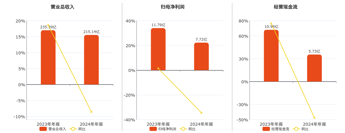 公司营业总收入为215.14亿元,较去年同报告期营业总收入减少20.25亿元,同比较去年同期下降8.60%。归母净利润为7.72亿元,较去年同报告期归母净利润减少4.07亿元,同比较去年同期下降34.51%。经营活动现金净流入为5.73亿元,较去年同报告期经营活动现金净流入减少5.24亿元,同比较去年同期下降47.77%。