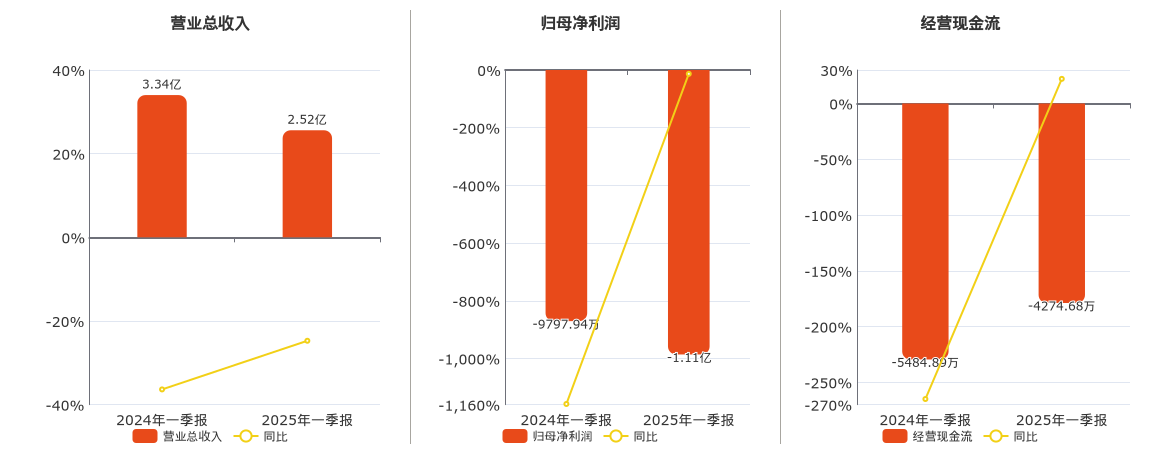 公司营业总收入为2.52亿元,较去年同报告期营业总收入减少8272.19万元,同比较去年同期下降24.73%。归母净利润为-1.11亿元,较去年同报告期归母净利润减少1298.82万元。经营活动现金净流入为-4274.68万元。