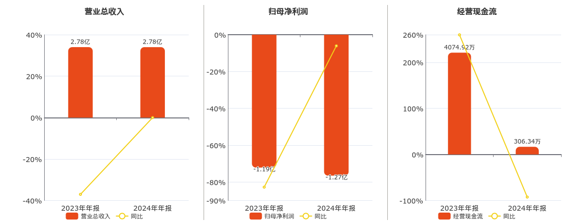 公司营业总收入为2.78亿元,在已披露的同业公司中排名第63,较去年同报告期营业总收入减少2.18万元,同比较去年同期下降0.01%。归母净利润为-1.27亿元,在已披露的同业公司中排名第62,较去年同报告期归母净利润减少724.85万元。经营活动现金净流入为306.34万元,在已披露的同业公司中排名第49,较去年同报告期经营活动现金净流入减少3768.59万元,同比较去年同期下降92.48%。