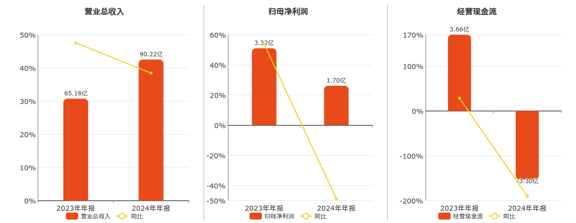 公司营业总收入为90.22亿元。归母净利润为1.70亿元,在已披露的同业公司中排名第6,较去年同报告期归母净利润减少1.62亿元,同比较去年同期下降48.77%。经营活动现金净流入为-3.30亿元,在已披露的同业公司中排名第11,较去年同报告期经营活动现金净流入减少6.96亿元,同比较去年同期下降190.05%。