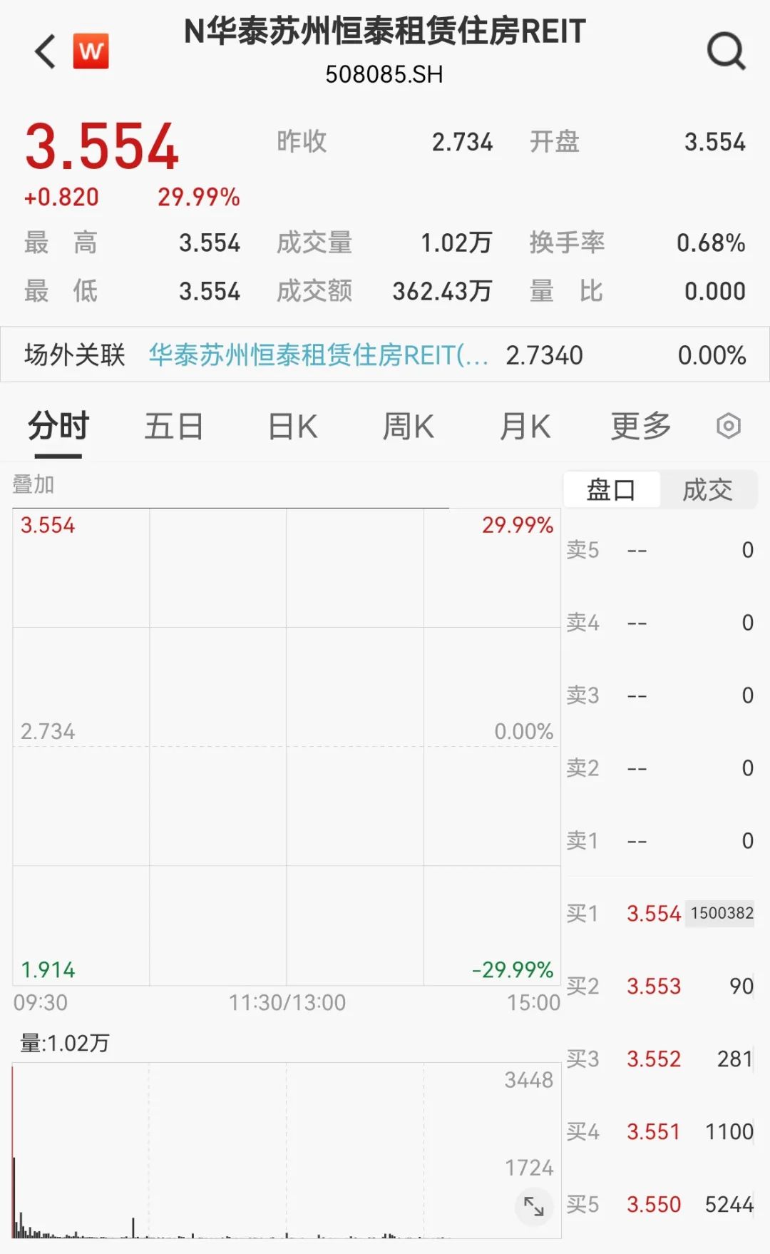 5月21日,华泰苏州恒泰租赁住房REIT上市,开盘大涨29.99%,达到首日上市涨幅上限。截至14点12分,华泰苏州恒泰租赁住房REIT最新价格为3.554元,成交金额达362.87万元,换手率仅0.68%