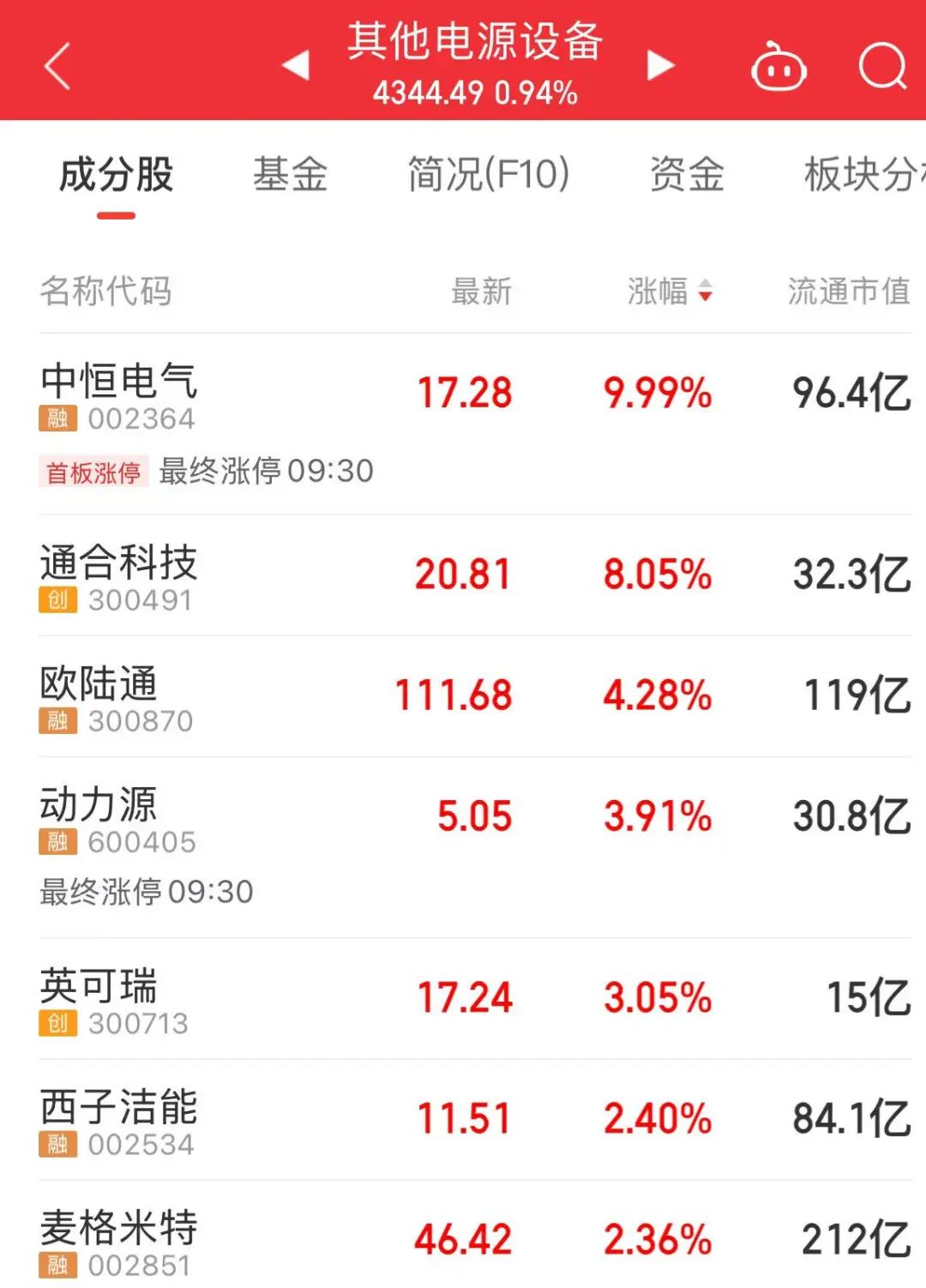 今天上午,电源设备板块上涨,中恒电气、通合科技大涨。