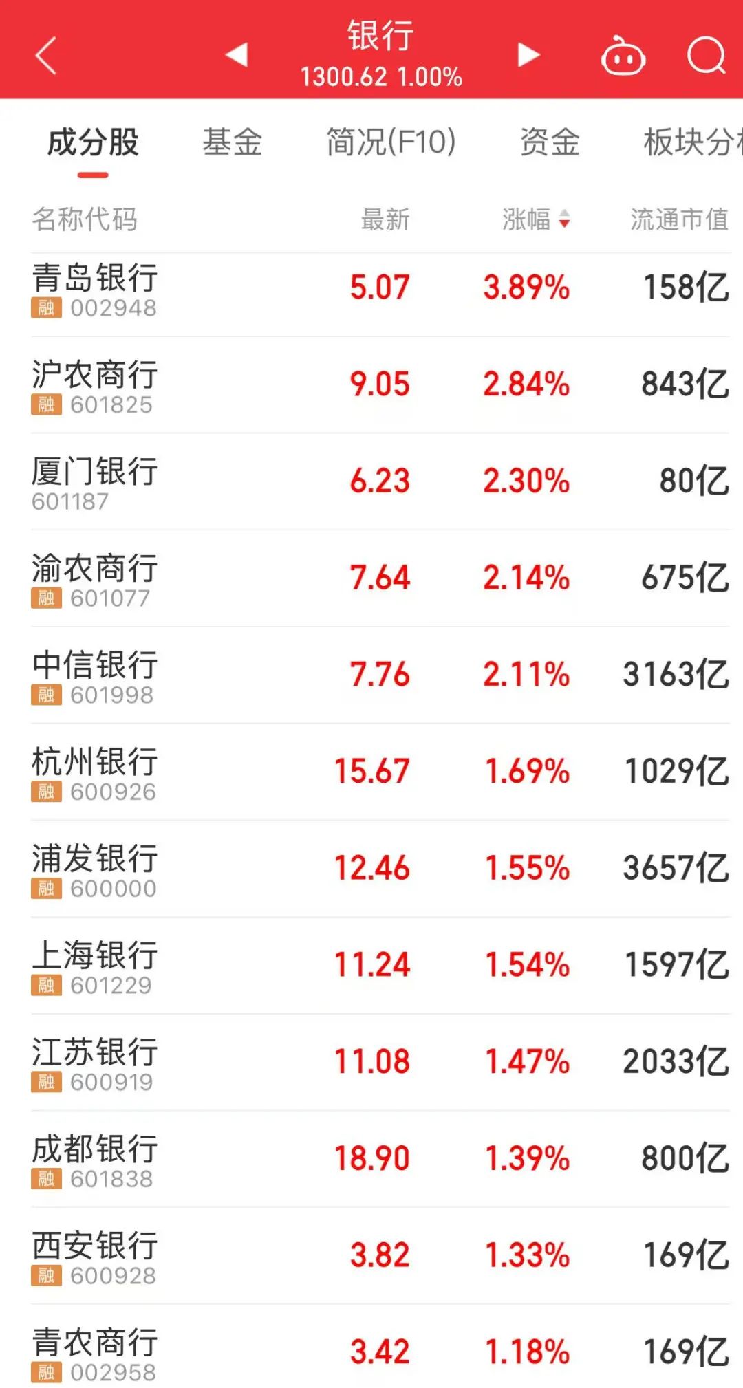 今天上午,银行板块上涨,青岛银行、沪农商行等个股涨幅居前。