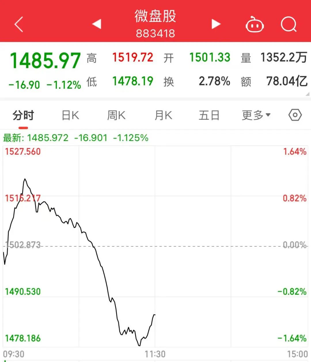 今天上午,微盘股指数巨震。早盘,微盘股指数一度涨超1%,再创历史新高。9:47左右,微盘股指数跳水。相同的时间点,北证50指数也开始回调。上午收盘,微盘股指数下跌1.12%,北证50指数下跌4.38%。