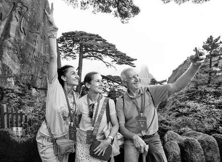 境外游客在安徽黄山风景区的迎客松前自拍留念。新华社发