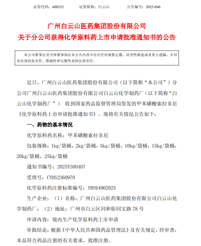 5月29日,白云山(600332.SH)公告称,公司分公司白云山化学制药厂收到国家药品监督管理局签发的甲苯磺酸索拉非尼《化学原料药上市申请批准通知书》。甲苯磺酸索拉非尼主要用于晚期肝癌的一线治疗、晚期肾癌的治疗、放射性碘治疗无效的局部晚期或转移性甲状腺癌。