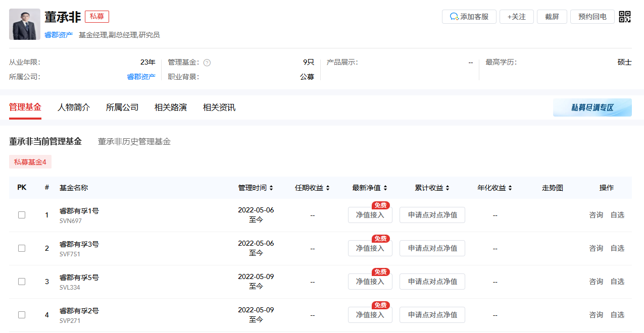 私募排排网显示,睿郡资产旗下有132只私募基金,其中董承非管理着“睿郡有孚1号”等4只产品。Wind数据显示,截至5月30日,董承非自2022年8月管理的“睿郡有孚1号”以来任职回报为6.78%,年化回报为3.4%。