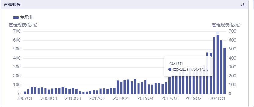 出色的业绩也曾吸引大量基民支持董承非在管的产品。同花顺iFinD数据显示,2013年年末董承非凭借155.77亿元的在管规模跻身百亿基金经理行列,2021年一季度时其在管规模高达667.42亿元。