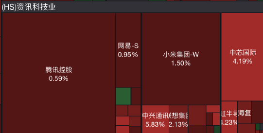 港股科技股领涨,快手涨5%,阿里巴巴涨超3%,美团涨2.6%,小米、京东涨1.5%,百度、网易涨1%。