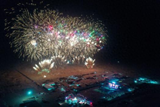 闭幕式尾声,一场15分钟的焰火表演在塔克拉玛干沙漠的夜空绚烂绽放。金色焰火如星雨坠落,照亮起伏的沙丘轮廓。车手们与领航员、工作人员并肩而立,手中的香槟在欢呼声中开启。众人举杯相庆,让这份历经半个月风沙洗礼的喜悦,在夜空与黄沙火的交织中,为环塔赛事画上璀璨的句点。