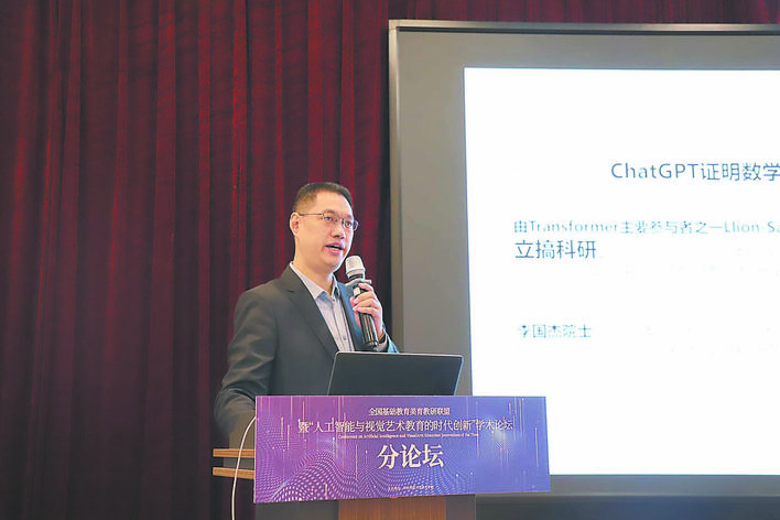 向大凤在全国基础教育美育教研联盟暨“人工智能与视觉艺术教育的时代创新”学术论坛上,介绍如何通过人工智能技术实现智慧书法教育。(资料图片)
